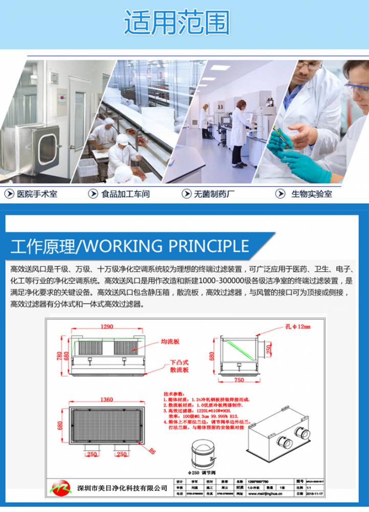 高效送風(fēng)口為千級、萬級、十萬級凈化空調(diào)系統(tǒng)較為理想的終端過濾裝置,可廣泛于醫(yī)藥、衛(wèi)生、電子、化工等行業(yè)的凈化空調(diào)系統(tǒng)。高效送風(fēng)口是用作改造和新建1000-300000級各級潔凈室的終端過濾裝置,是滿足凈化要求的關(guān)鍵設(shè)備。高效送風(fēng)口包含靜壓箱,散流板,高效過濾器,與風(fēng)管的接口可為頂接或側(cè)接。