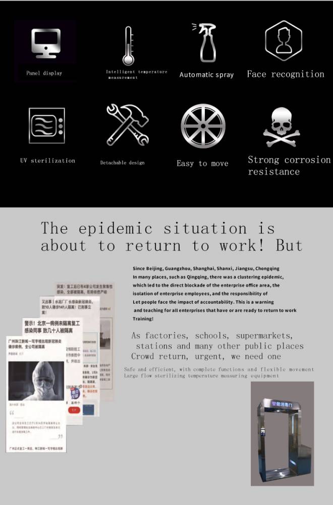 消毒溶液采用食品級(jí),對(duì)通過的人員以及物品進(jìn)行非接觸式消毒,同時(shí)可以通過添加人體測(cè)溫報(bào)警器和熱成像體溫檢測(cè)儀對(duì)人員進(jìn)行體溫檢測(cè)。