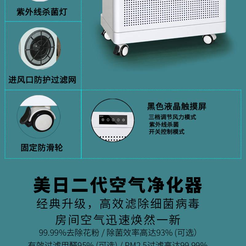每日凈化空氣凈化器,紫外線快速殺菌、快速除甲醛、PM2.5、過濾煙塵、殺滅細菌和病毒、清除異味、降解有毒化學氣體、凈化清新空氣、呵護人體健康等;多檔風速、多向氣流、及低噪音等。